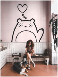 Smiling woman with her dog inside a stylish cafe with artistic wall decor.