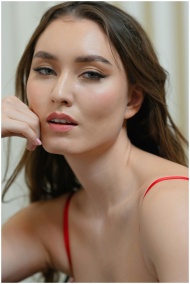 Intimate close-up portrait of a young woman in a red dress, indoors.