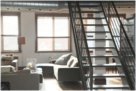 Bright and modern loft interior featuring cozy furniture and industrial elements, perfect for urban living.