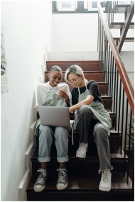 Full body of positive young diverse female friends in trendy clothes and aprons watching funny video on laptop sitting on staircase