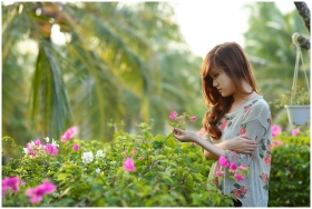 Pensive young woman holding a flower, surrounded by lush garden flora.