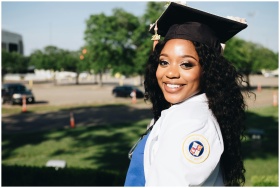 African American woman in graduation attire, smiling outdoors, symbolizing academic success.