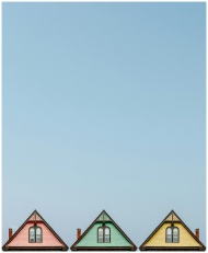 Three colorful triangular rooftops against a clear blue sky, showcasing simple architectural design.