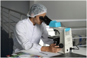 Scientist in a lab coat using a microscope to conduct research, focusing on healthcare improvements.