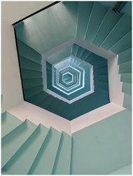 Vertical view of a geometric stairwell with a blue pattern in Puducherry, India.