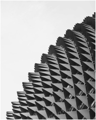 Dynamic black and white photo of a futuristic architectural design featuring geometric patterns.