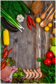 Colorful fresh ingredients including vegetables, seafood, and herbs arranged on a rustic wooden table.