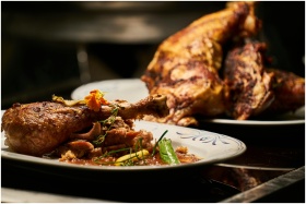 Close-up of a deliciously roasted chicken dish served with garnish, highlighting fine cuisine.