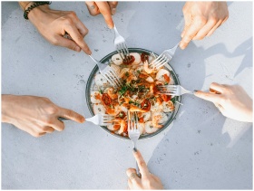 Top view of people sharing a gourmet shrimp and oc