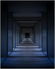 A dramatic view of a modern hallway with symmetrical columns creating an infinite perspective.