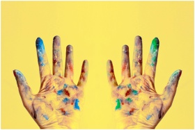 Colorful fingers spread against a bright yellow ba