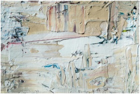 Close-up of textured abstract painting with layered acrylic paint in neutral tones.