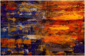 Dynamic abstract painting featuring vibrant blue, orange, and yellow hues on canvas.