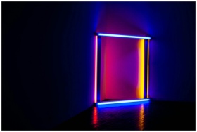 Colorful neon light installation casting vivid reflections in a dark room atmosphere.