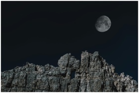Scenic night view of a full moon rising above rock