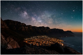A stunning view of a coastal city illuminated under a starry night sky, framed by mountains and sea.