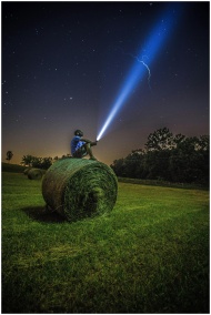 A man sits on a hay bale in a field, shining a flashlight into the night sky full of stars.