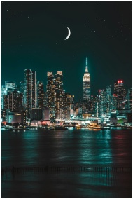 Captivating nighttime view of New York City skyline with illuminated skyscrapers and moon.