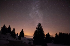 A serene starry night sky over snowy trees in Viuz-la-Chiésaz, capturing the Milky Way.