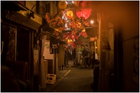 Bustling Tokyo street scene at night with paper lanterns and people.