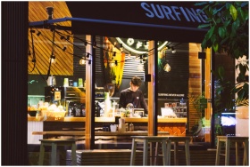Warmly lit café interior with a barista preparing