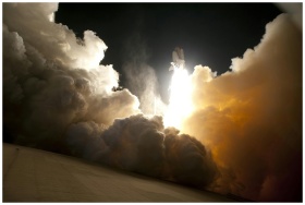A dramatic image of a space shuttle launching into the night sky, surrounded by billowing smoke and intense light.
