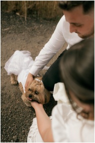 A bride and groom petting their dog, dressed for the wedding.