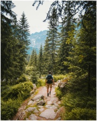Man hiking on a forest trail in Tatra Mountains, Poland, surrounded by lush greenery.