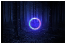 Mystical forest scene at dawn with fog, light, and