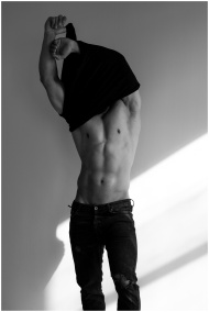 Artistic black and white portrait of a muscular man undressing in studio lighting.