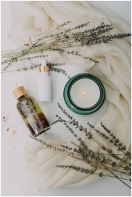 A calming flat lay of spa essentials featuring lavender and candles for relaxation.