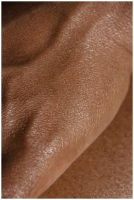 Closeup full frame hand of crop anonymous person with veins and smooth skin placed on leg in light room at home