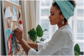 Woman creating a vision board with images in a sty