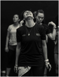 Women expressing joy and camaraderie during a group workout session.