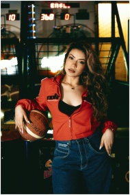 Confident woman in casual outfit posing with basketball indoors under neon lights.