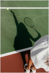 Shadow of a tennis player with racket on a green court, ready to serve.