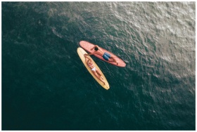 Drone shot of a couple on surfboards in the ocean,