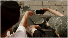 Two teenagers sitting outdoors with a skateboard, looking at a smartphone, enjoying leisure time together.