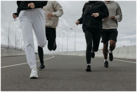 Four people jogging together on an urban road, showcasing fitness and teamwork.