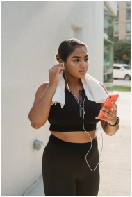 A young woman in activewear with earphones and pho