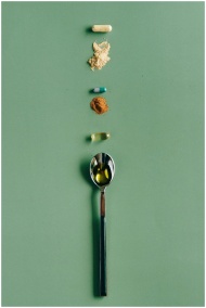 Assorted supplements and a spoon laid out on a green surface, showcasing health concepts.
