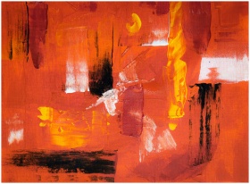 Dynamic orange and red abstract painting showcasing vibrant textures.