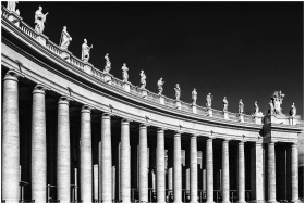Dramatic black and white photograph of Vatican colonnade with statues, highlighting classic architecture under a clear sky.