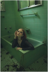 Artistic portrait of a woman in a vintage green tiled bathroom with moss, creating a moody and dramatic atmosphere.