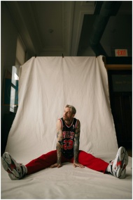 Athletic man in a basketball jersey poses indoors, showing his tattoos and stylish sneakers.