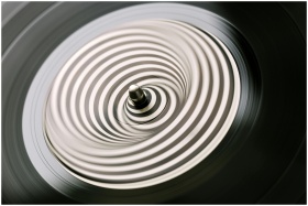 A close-up view of a vinyl record spinning, creating an abstract spiral pattern. Retro and artistic feel.