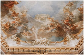 Intricate Baroque ceiling mural with classical art figures, creating a divine scene.