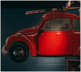A vibrant mural of a vintage red car painted on an interior wall, showcasing classic automotive design.