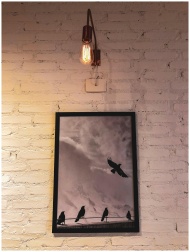 Vintage art of bird silhouettes under an Edison bulb on a brick wall.