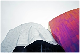 A contemporary architectural marvel with flowing forms and vibrant colors, captured from a low angle.